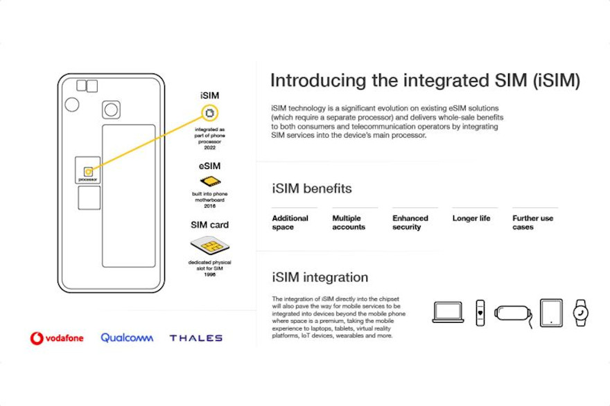 Como comenté al principio, la iSIM es una apuesta de Vodafone, Qualcomm y Thales, tres empresas relacionadas con las telecomunicaciones. Su propuesta es una mejora y evolución de la eSIM integrando el chip en el procesador en vez de crear un procesador dedicado para la SIM, como ocurre ahora con la eSIM.