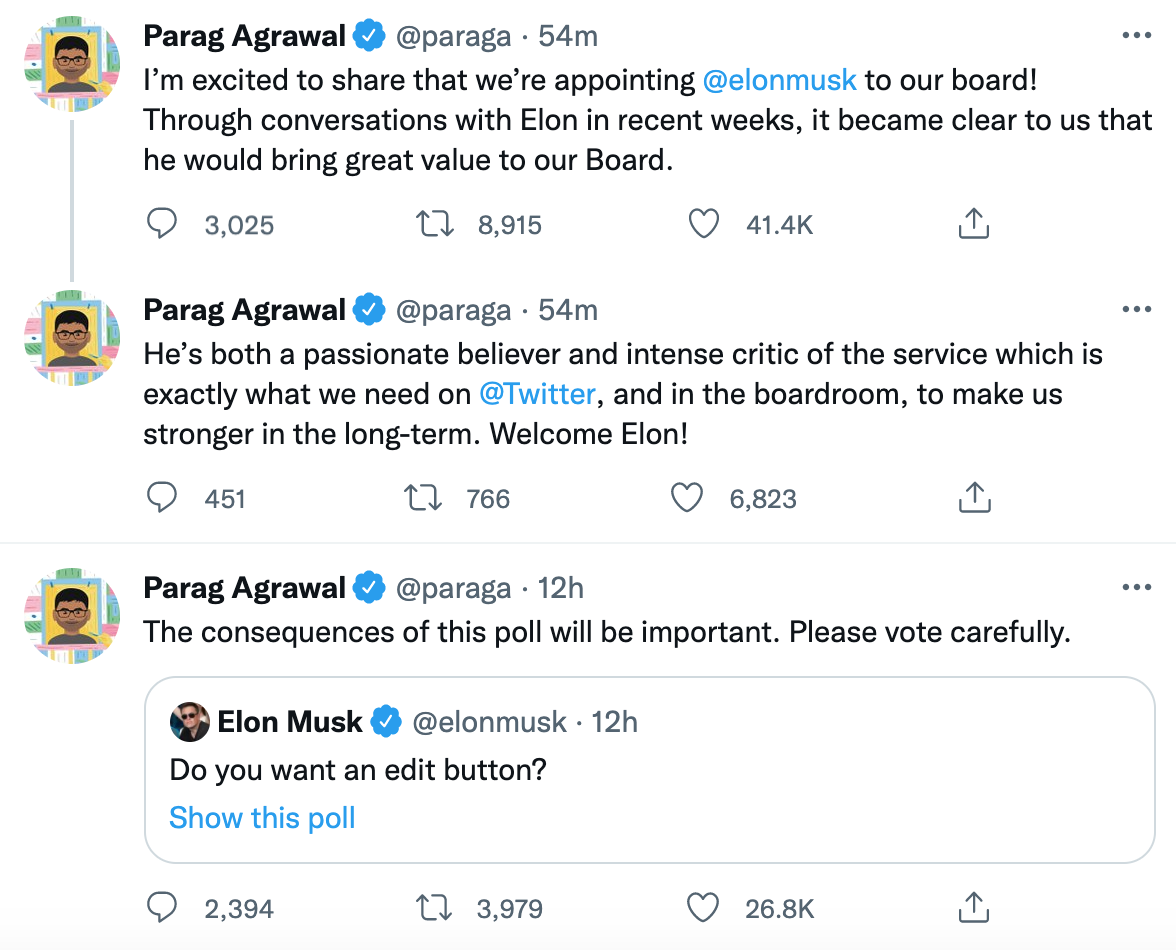 En un tuit, el CEO de Twitter, Parag Agrawal le dio la la bienvenida al CEO de Tesla y comentó que está emocionado de la unión de Elon Musk en la junta directiva, que estuvo conversando con él en las últimas semanas y que considera que el magnate aportará un gran valor al grupo.