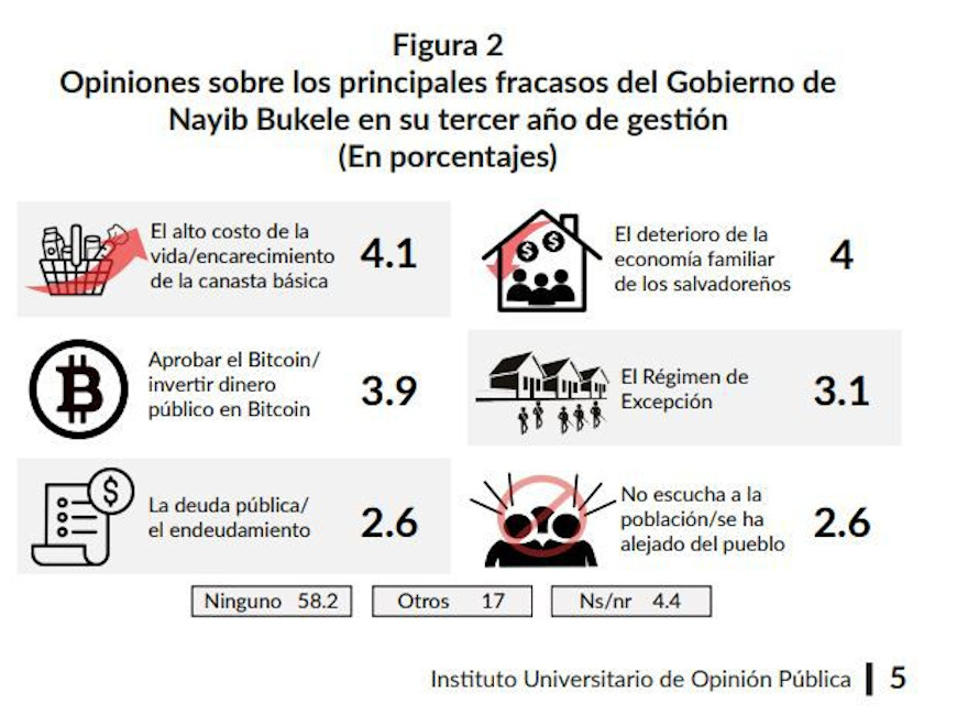 El informe sostiene que la Ley Bitcoin es considerada por los salvadoreños como "uno de los fracasos del gobierno de Nayib Bukele", ya que consideran que el gobierno "invirtió el dinero público en la compra de Bitcoin", con 3,9%. Otros puntos que desaprueban al presidente son: alto costo de la vida (4,1%), deuda pública (2,6%), deterioro de la economía familiar (4%), régimen de excepción (3,1%) y que el gobierno "no escucha a la población" (2,6%).