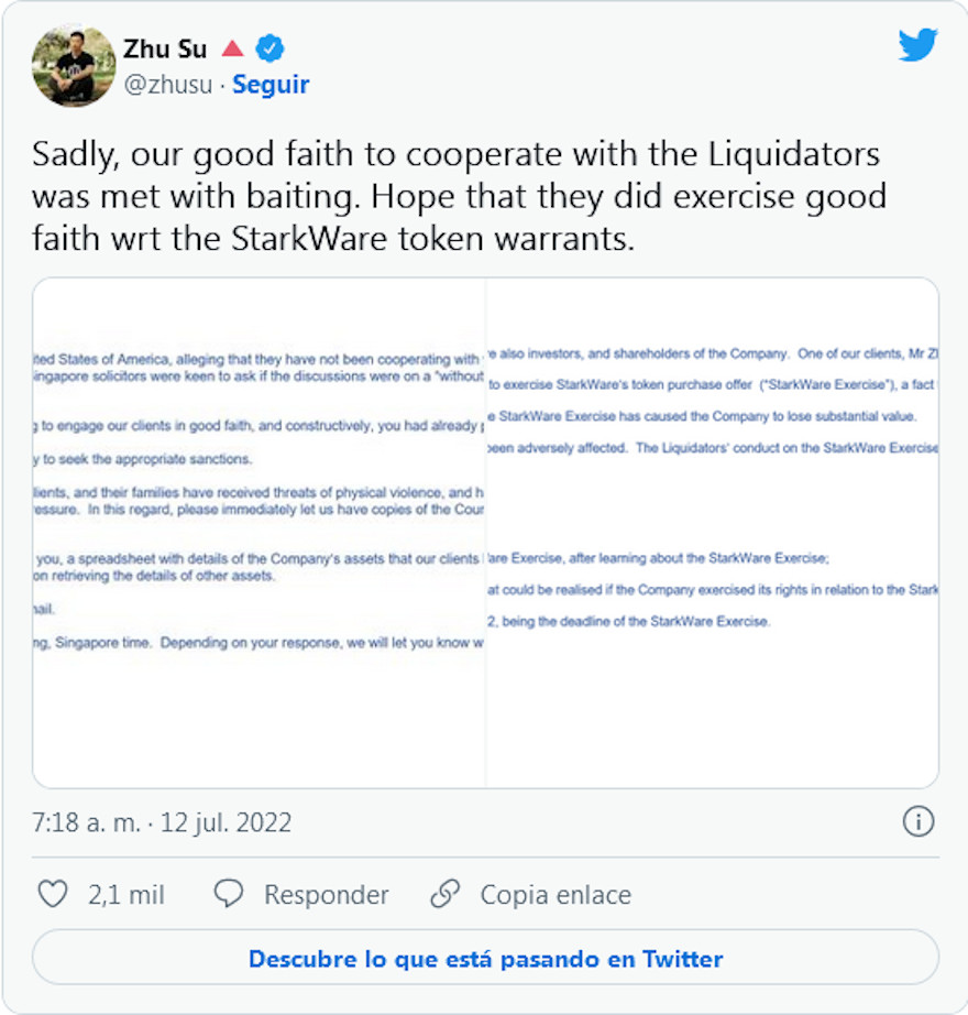 Zhu sólo ha reaparecido en Twitter para negar que no hayan cooperado. Según él, "nuestra buena fe para cooperar con los liquidadores se encontró con un cebo". Asimismo, el cofundador de Three Arrows Capital publicó dos cartas de su abogado. En una, aseguraba que tanto ellos como sus familias habían recibido "amenazas de violencia física". En la otra, dejaba patente su preocupación por la mala gestión que los liquidadores estaban realizando con los activos de su fondo de cobertura.