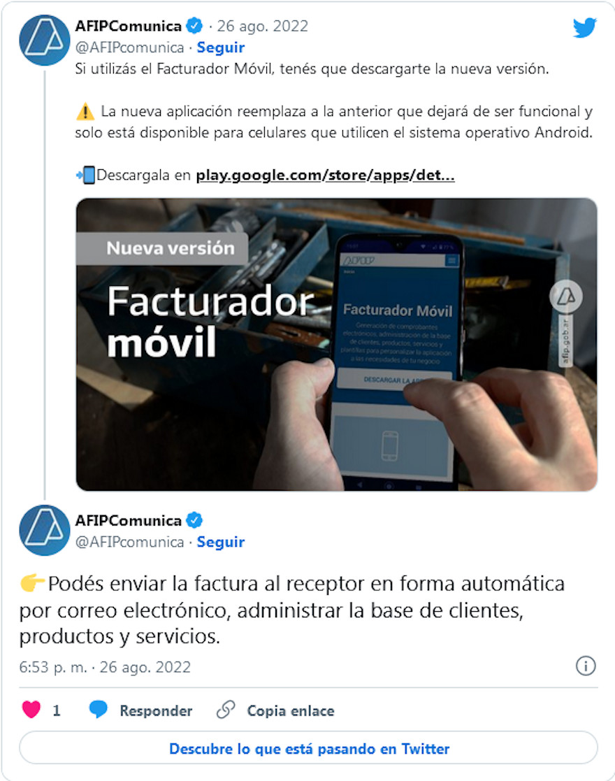 La versión anterior del facturador dejará de funcionar el domingo 28 de agosto, y los usuarios del "Facturador Móvil" deberán instalar la nueva versión para poder facturar desde el celular. La aplicación permite, entre otras ventajas, enviar la factura al receptor en forma automática por correo electrónico.