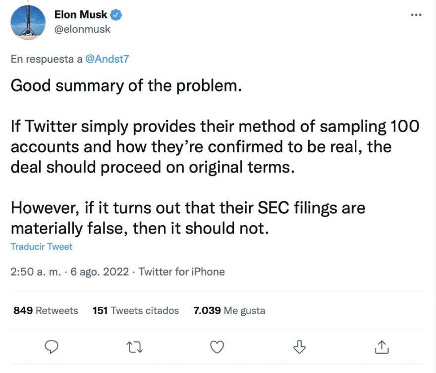 "Buen resumen del problema. Si Twitter simplemente proporciona su método de muestreo de 100 cuentas y cómo se confirma que son reales, el trato debería continuar en los términos originales", remarcó Musk.