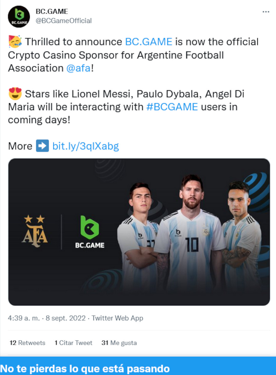 Desde BC.GAME comentaron "¡Emocionado de anunciar que https://BC.GAME es ahora el patrocinador oficial de Crypto Casino para la Asociación del Fútbol Argentino @afa. Estrellas como Lionel Messi, Paulo Dybala, Angel Di Maria interactuarán con los usuarios de #BCGAME en los próximos días!".