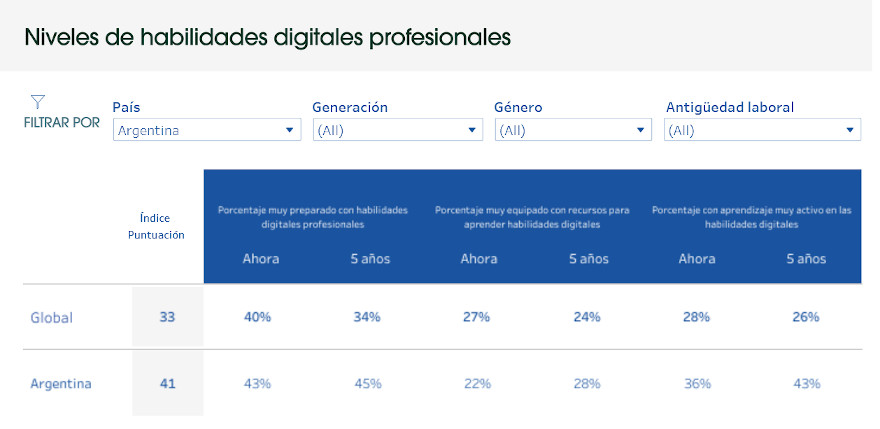 A pesar de estos resultados, el porcentaje de personas que está aprendiendo habilidades digitales sigue siendo bajo: solo un 36% de los encuestados argentinos manifiesta estar capacitándose muy activamente con las habilidades necesarias en la actualidad, y un 43% afirma estar capacitándose muy activamente en las habilidades necesarias para los próximos 5 años. Las cifras aumentan un poco entre millennials (39% dice estar adquiriendo las habilidades necesarias hoy y 49% las que se requerirán en los próximos 5 años) y los nacidos en la Generación Z (40% y 42% respectivamente).