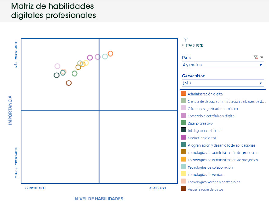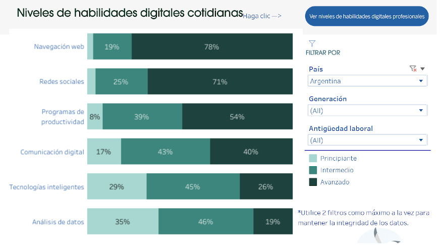 En Argentina, un 83% de todos los encuestados de la Generación Z afirma tener conocimientos avanzados de redes sociales y un 78% sostiene tenerlos en navegación web. Incluso, los millennials demuestran saber sobre marketing digital y administración digital, pero la mayoría está lejos alcanzar niveles "avanzados" en tecnologías requeridas por los empleadores, tales como: Inteligencia Artificial; programación y desarrollo de aplicaciones; tecnología colaborativa; ciencia de datos; visualización de datos y diseño creativo.