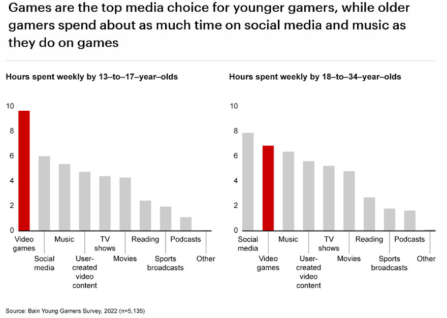Todo esto sugiere que los juegos tomarán el tiempo de los consumidores de otras formas de medios y serán la plataforma fundamental para otras experiencias mediáticas y no mediáticas, convirtiéndose en una parte cada vez mayor de nuestra vida diaria.