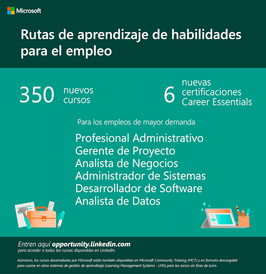 Microsoft y LinkedIn anunciaron la siguiente etapa del programa Habilidades para el empleo, a través del cual brindarán acceso gratuito a 350 cursos y seis nuevas Certificaciones Career Essentials, para seis de los empleos con mayor demanda en la economía digital.