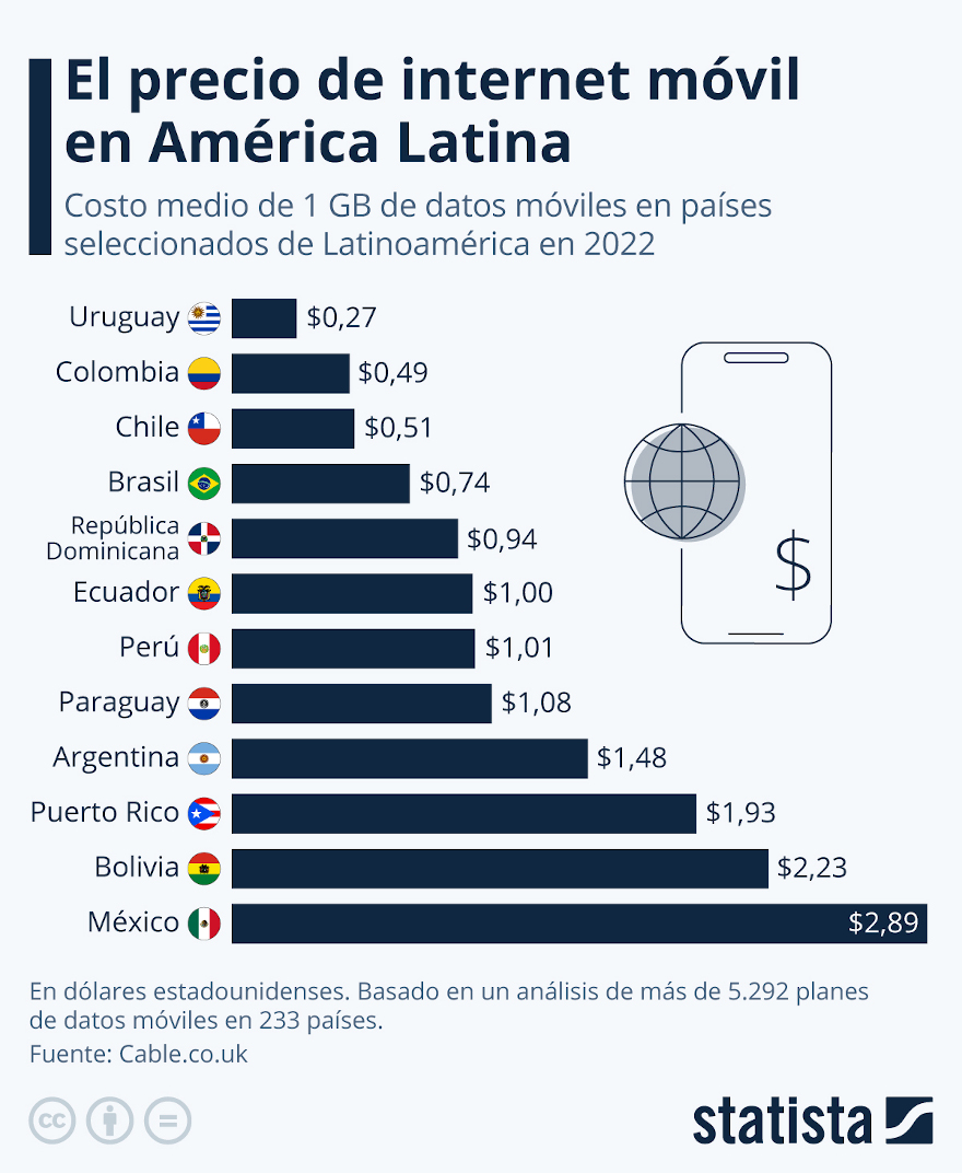 En Uruguay, el internet móvil cuesta en promedio 0,27 dólares por cada gigabyte (GB) de datos. En América Latina le siguen Colombia (0,49 dólares), Chile (0,51 dólares), Brasil (0,74), República Dominicana (0,94) y Ecuador (un dólar).