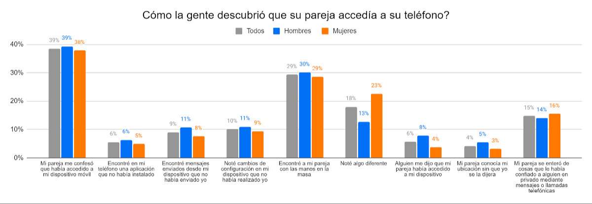 De los encuestados que sospechan que su pareja ha tenido acceso a su teléfono sin su consentimiento, 39% dijo que su pareja confesó el acto, 29% sorprendió a su pareja "con las manos en la masa", y 15% dijo que su pareja sabía cosas que ellos habían compartido privadamente a través de su teléfono.