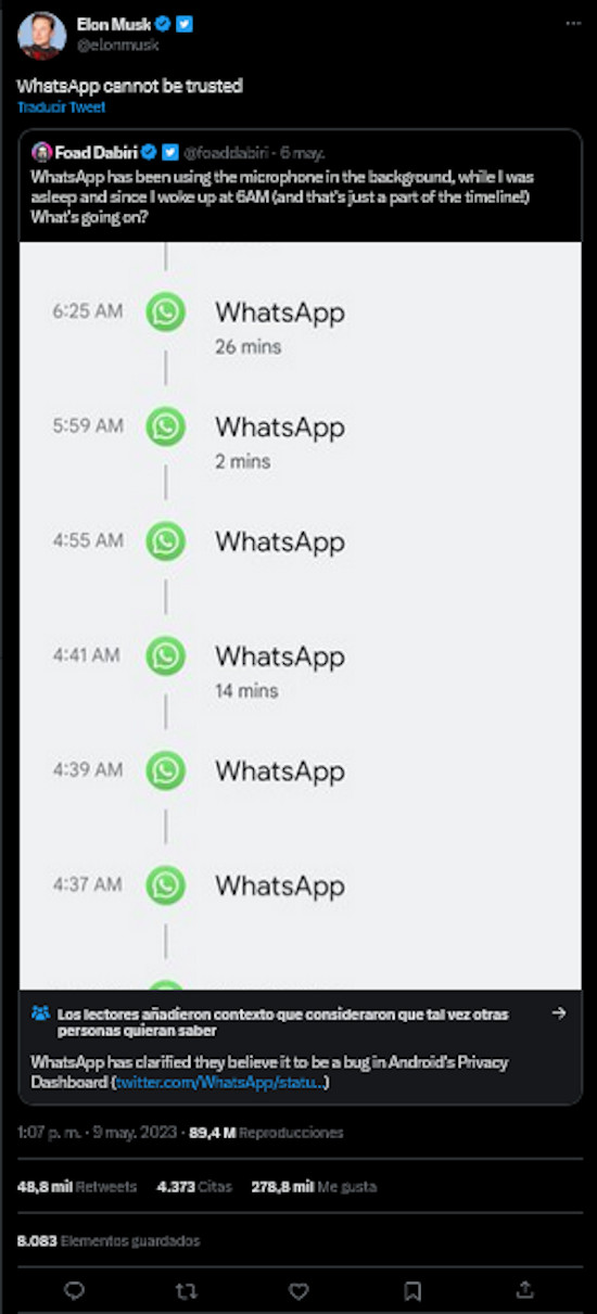 Inmediatamente esto comenzó a replicarse en la red, con otros usuarios opinando, hasta que el propio Elon Musk se metió en la conversación y atacó a la red de mensajería.