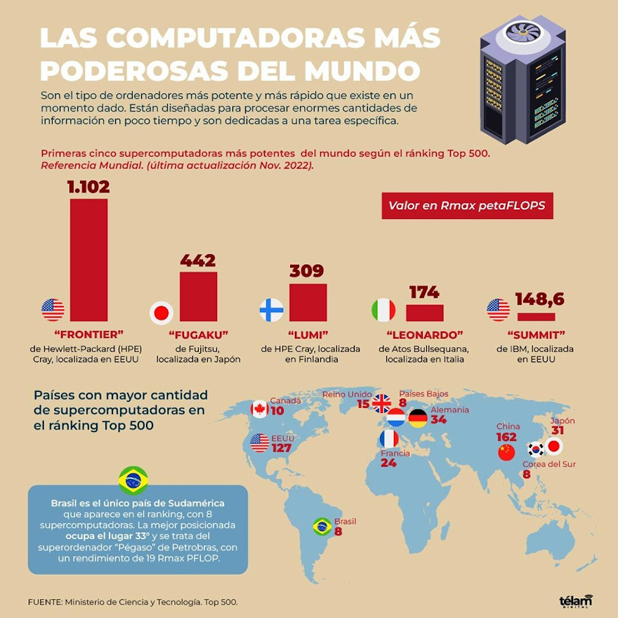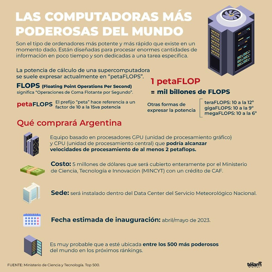 Una supercomputadora es un ordenador con capacidades de cálculo muy superiores a las comunes, que además está orientada a fines específicos. La mayoría de las supercomputadoras se componen de muchas CPUs (Unidades Centrales de Procesamiento, por su sigla en inglés) menos poderosas pero trabajando de forma conjunta con un objetivo común, aumentando tanto la potencia del conjunto como su rendimiento, indicó Télam.