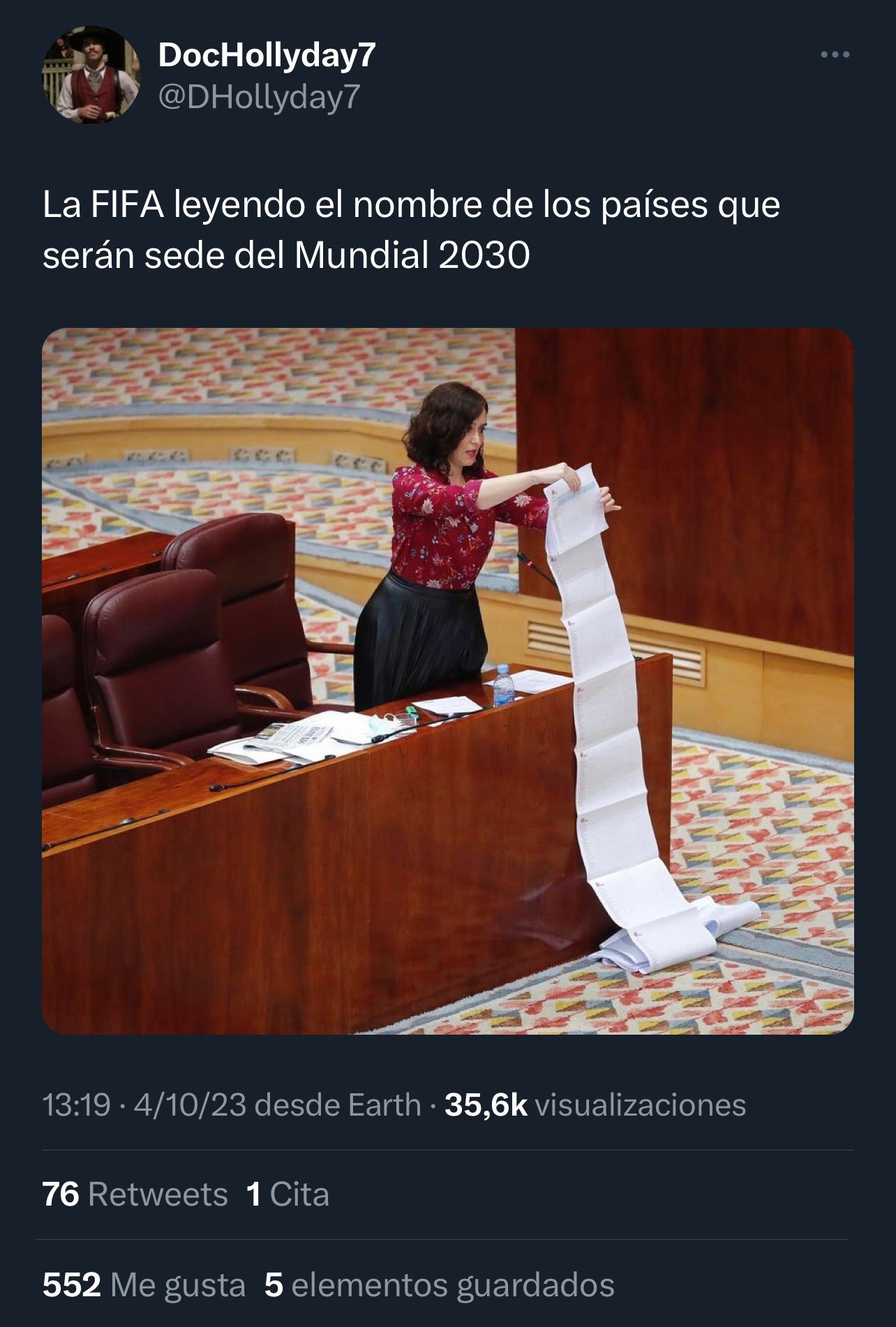 Por otro lado, los usuarios de la red social también hicieron bromas acerca de la cantidad de sedes que tendrá el mundial. Por eso, @DHollyday publicó: "La FIFA leyendo el nombre de los países que serán sede del Mundial 2030".