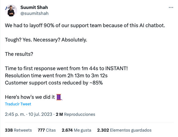 "Tuvimos que despedir al 90% de nuestro equipo de soporte debido a este chatbot de IA. ¿Duro? Sí. ¿Necesario? Absolutamente", escribió Suumit Shah en su cuenta de Twitter.