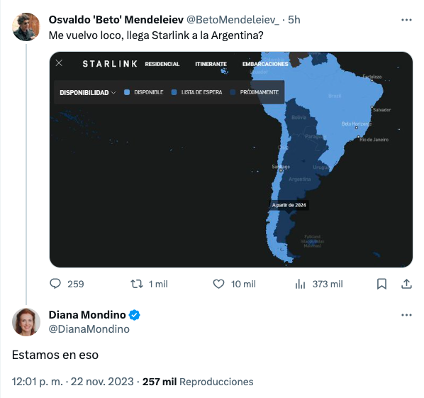 Según el tuit de Diana Mondino en X, indicaría que Starlink llegaría a la Argentina en 2024.