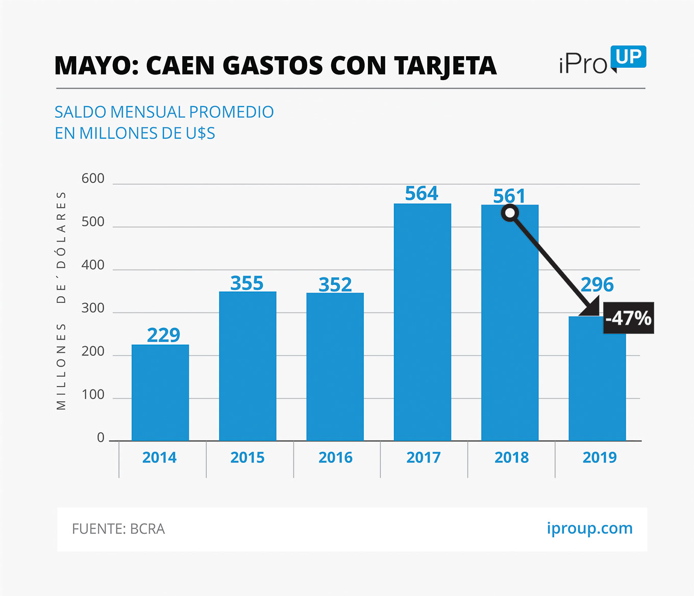 Sobre este último punto, los datos de mayo del Banco Central demuestran que el saldo por compras con plásticos en moneda extranjera promedió los u$s296 millones. ¿Qué implica? Considerando que en 2018 esa cifra había trepado a u$s561 millones, representa un desplome interanual de casi 50%. Además, se trata de la cifra más baja desde mayo de 2014.
