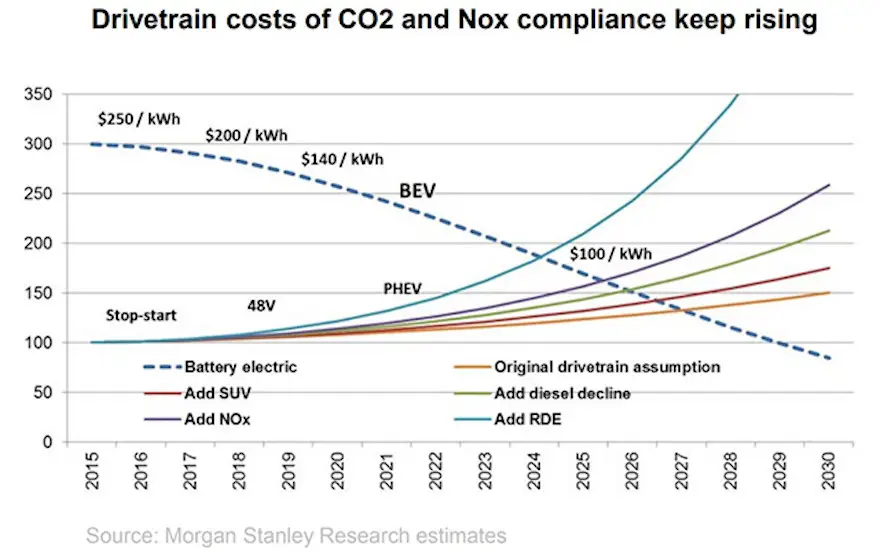 Morgan Stanley espera que los precios se equiparen para el año 2024, que será el año en el que por primera vez, se pueda comprar un coche eléctrico y uno de gasolina por el mismo precio.