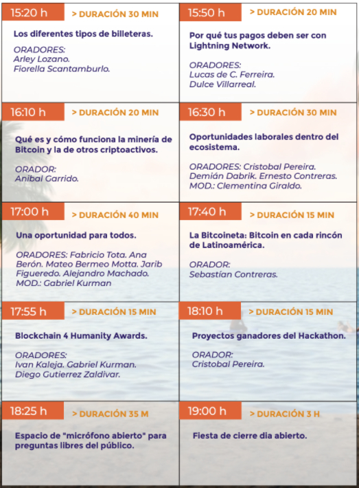 El 16 y 17 se realizará además la conferencia "Adopting Bitcoin" con un foco más técnico, centrándose en la tecnología de Lighting Network. También habrá clínicas legales personalizadas, una feria artesanal para transar a través de bitcoin, artistas gráficos y musicales en vivo y una feria con stands de las empresas del sector.