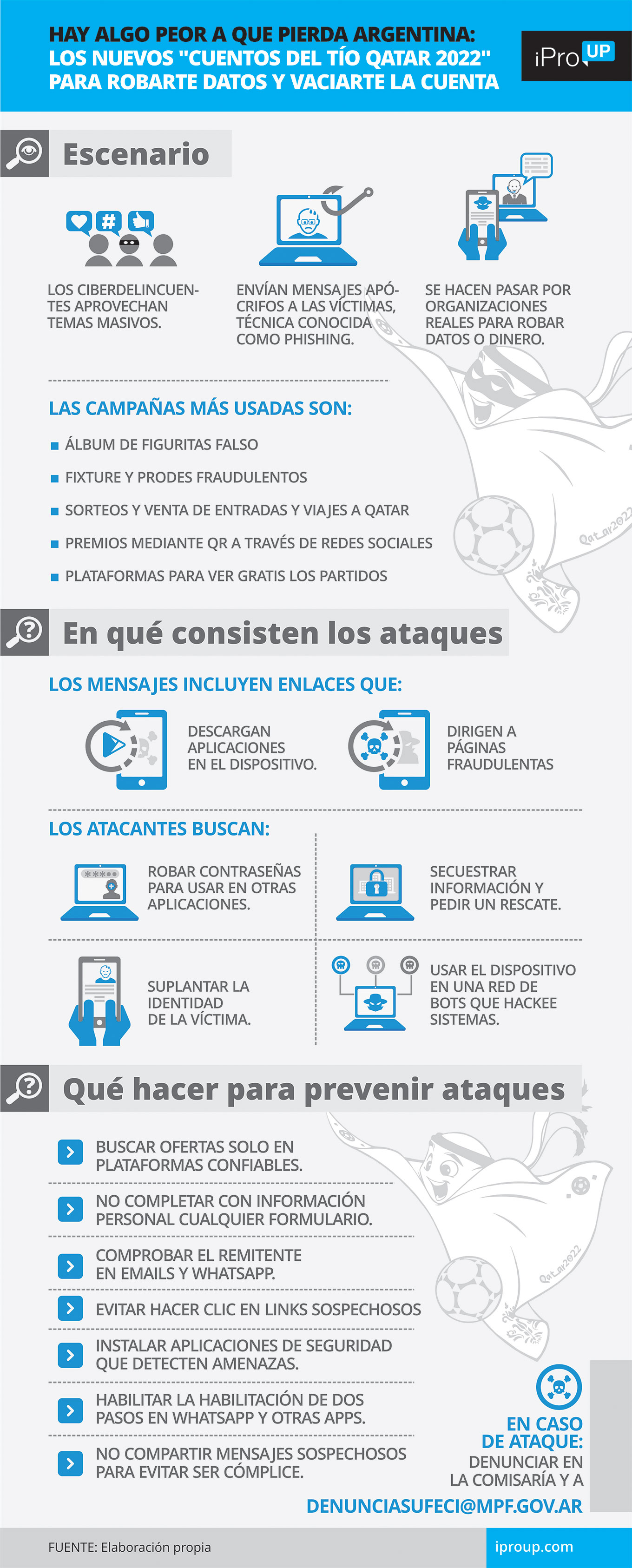 Maniobras de phishing –páginas web, mensajes de mail o Whatsapp falsificados– con consignas sobre el Mundial, "súperpromociones" en camisetas y pelotas, estadías a precios imbatibles y ofertas demasiado buenas para ser verdad, son solo algunas de las maniobras que los piratas cibernéticos ya llevan a cabo y preocupan a más de uno.