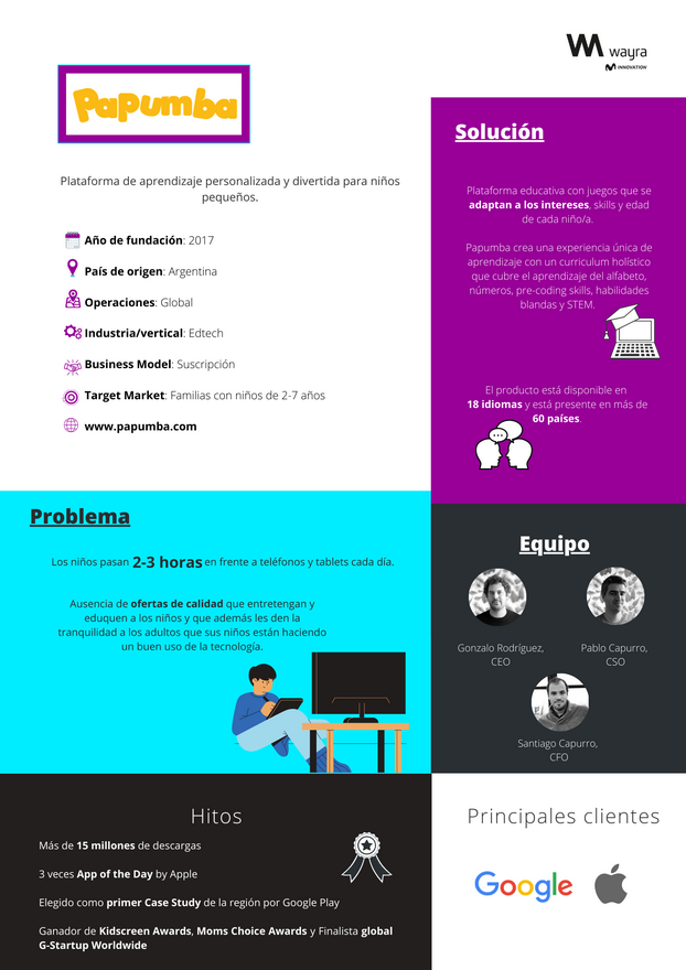 "La ausencia de aplicaciones con contenido educativo de calidad, que a la vez fueran entretenidas para los niños y que ofrecieran una solución valiosa para los padres, sin publicidad y en idioma local, nos motivaron a empezar este camino", comenta a iProUP Pablo Capurro, CSO de Papumba, una plataforma de aprendizaje personalizada y divertida para niños.